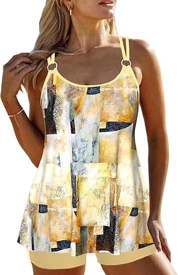 • Fit of Tankini Set: Tank top is loose with ample room in bust and tummy for all-day comfort. Board shorts fit snugly for sport-time modesty. Note: Petite figures may find the tankini top covers most of the shorts. For standard figure, follow size chart; if not, size up/down per measurements. We're always refining fits but can't suit every body—thanks for understanding if sizing's off.