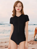 Women Black Short Sleeve Zipper Up One Piece Swimsuit