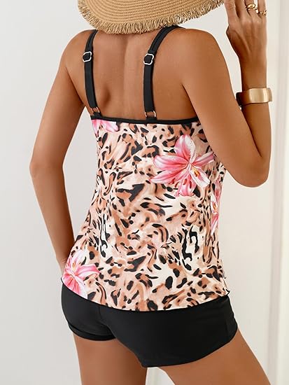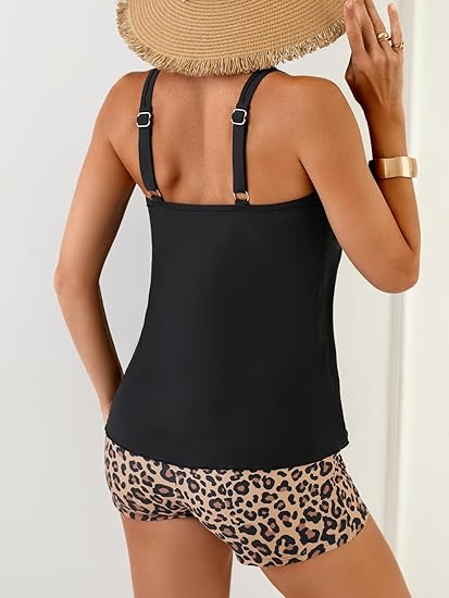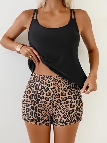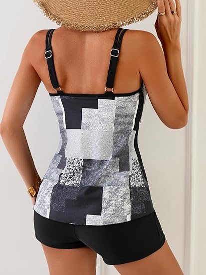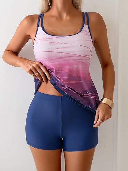 This stylish two-piece swimwear features a flowy tank top, adjustable straps, supportive padding, and full-coverage boyshorts for a comfortable, slimming fit—perfect for beach days, pool parties, surfing, and tropical vacations.