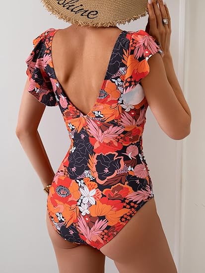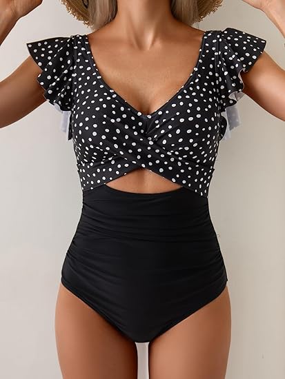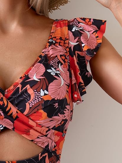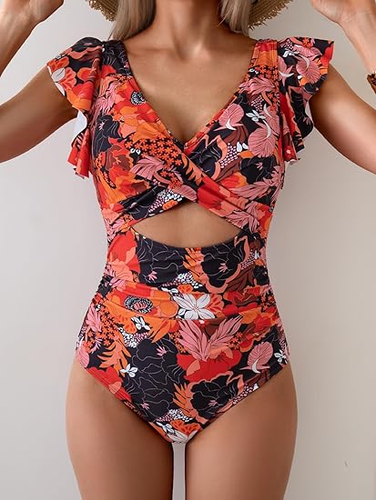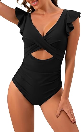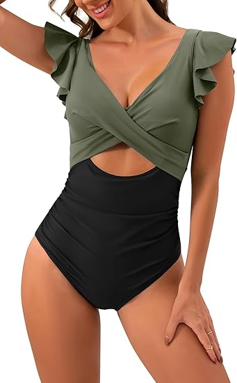 - Feature: Soft removable pads, v neckline, ruffle sleeve, criss-cross, Front cutout, ruched details at the waist, v back, fully lined, a modest but flattering swimwear