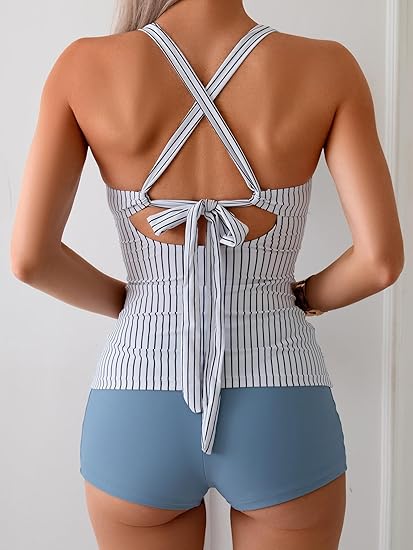 Women’s Ruched V-Neck Tankini Set with Wrap Tie-Back & Swim Shorts