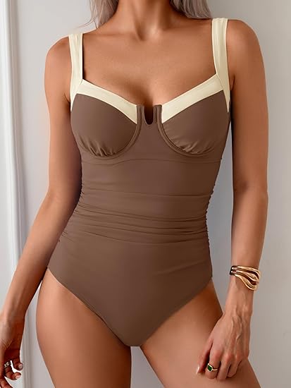 Designed to flatter your curves, this bathing suit features a sculpting ruched waist, supportive push-up design, adjustable straps, stylish color block details, and soft stretch fabric for beach or pool wear.